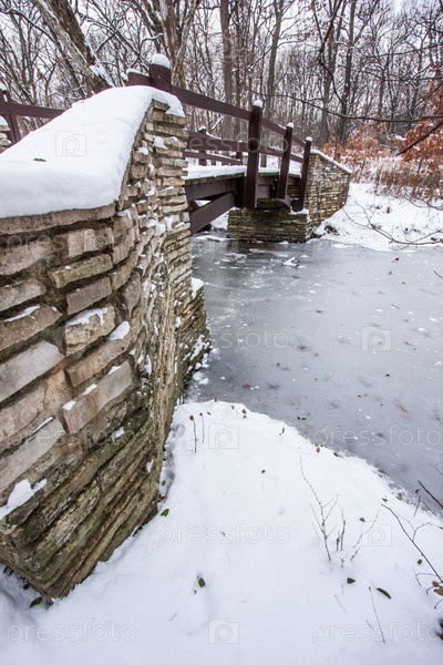 Деревенский мост через замерзшую реку зимой