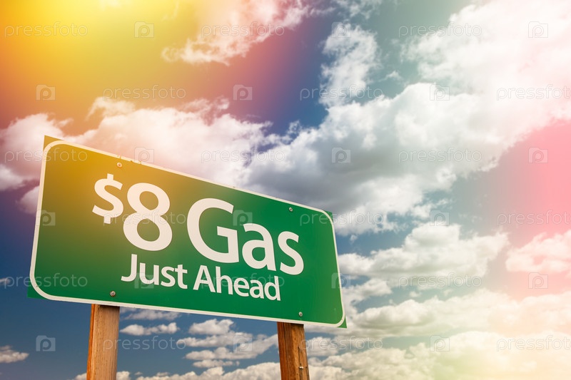 Зеленый дорожный знак газа за 8 долларов против облачного неба