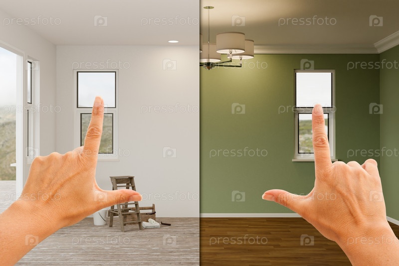 3D-иллюстрация женских рук, обрамляющих до и после оливково-зеленых покрашенных стен в пустой комнате дома