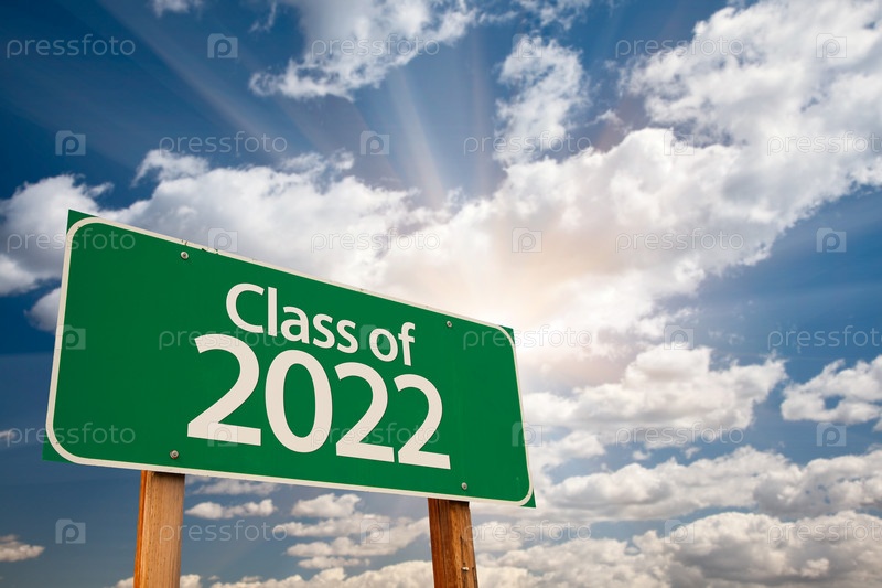 Класс 2022 года "Зеленый дорожный знак с драматическими облаками и небом"