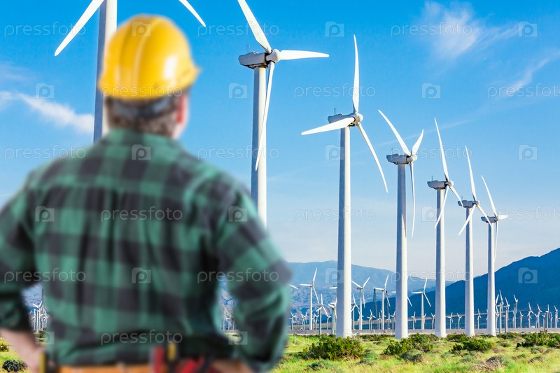 Подрядчик-мужчина в поясе с инструментами и в каске перед ветряными турбинами альтернативной энергетики
