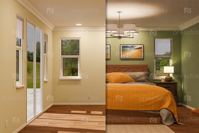 3D-иллюстрация бок о бок до и после пустой комнаты и полностью меблированной комнаты