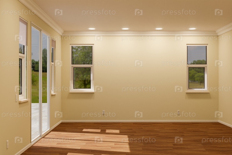 3D-иллюстрация Недавно реконструированная комната в доме с готовыми деревянными полами, лепниной, светло-желтой краской и потолочными светильниками