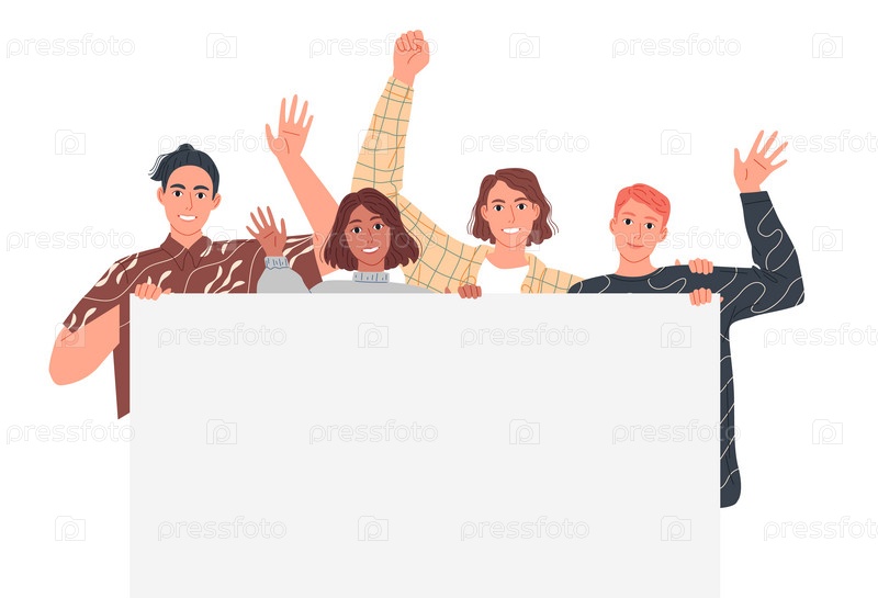 Люди держат большое знамя и машут руками в знак приветствия