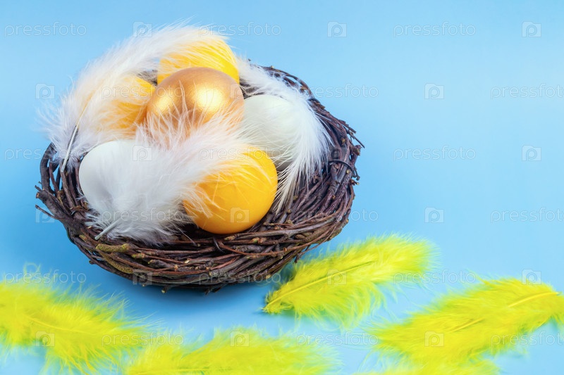 Плетеное гнездо из ветвей деревьев с золотыми, желтыми и белыми яйцами, украшенными перьями на синем фоне. Весенний и пасхальный фон. Копировать пространство