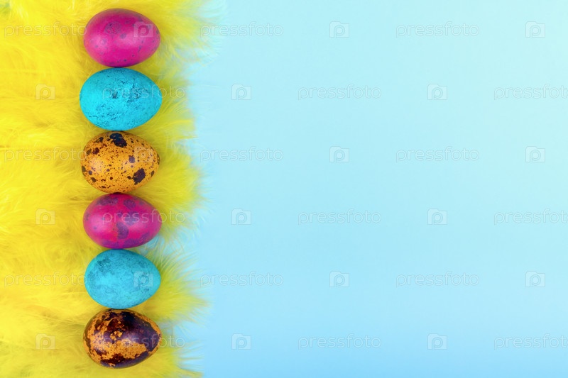 Ряд ярко окрашенных разноцветных перепелиных яиц, украшенных желтыми перьями на синем фоне. Вид сверху и плоская планировка. Пасхальный минималистичный фон с копировальным пространством