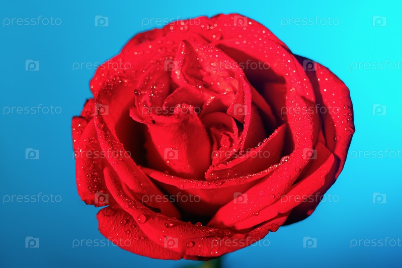 Крупный план одной красной розы на синем градиентном фоне с подсветкой. Подарок на свидание. День Святого Валентина. Романтический подарок. Празднование годовщины свадьбы или дня рождения. Концепция цветочного бизнеса