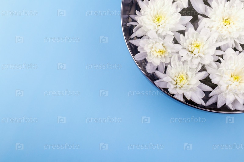 Крупным планом белые цветы хризантемы плавают в металлической миске с водой на синем фоне. Концепция релаксации, отдыха и спа-процедур. Вид сверху и плоская планировка. Копировать пространство