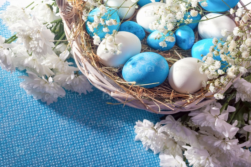 Крупный план голубых и белых куриных яиц в плетеной корзине с сеном. Пасхальный сельский и деревенский фон