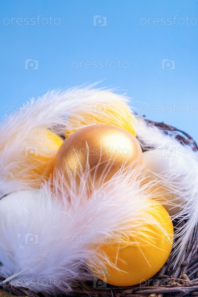 Крупный план золотых, желтых и белых яиц, украшенных перьями на синем фоне. Пасхальный финансовый вертикальный фон. Понятие денежной удачи и богатства. Символ экономии. Копировать пространство
