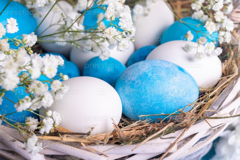 Крупный план окрашенных в синий и белый цвет куриных яиц в плетеной корзине с сеном, украшенный белыми цветами. Пасхальный сельский и деревенский фон. Свет раннего утра
