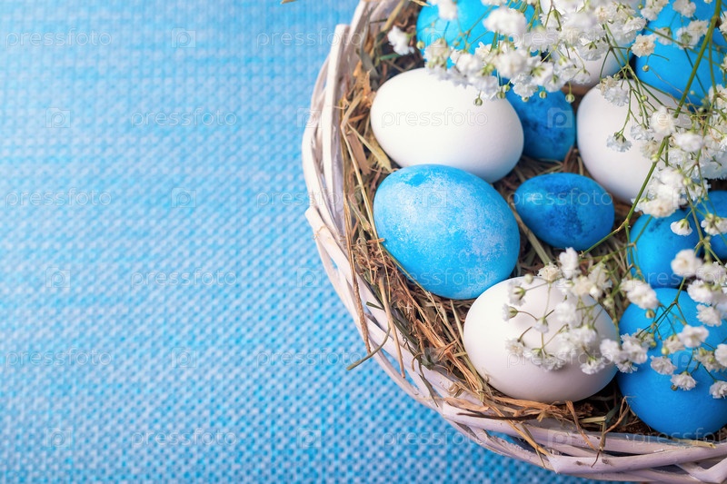 Крупный план голубых и белых куриных яиц в плетеной корзине с сеном. Пасхальный сельский и деревенский фон
