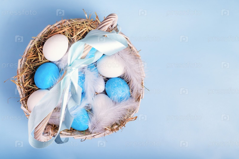 Вид сверху и плоская корзина с сеном, окрашенными в синий и белый цвета яйцами и перьями. Простой и минималистичный пасхальный фон