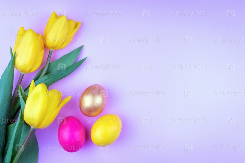Крупный план желтых тюльпанов и крашеных яиц на фиолетовом фоне. Весенний и пасхальный минималистичный фон