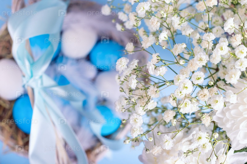 Крупный план белых весенних цветов на размытом фоне плетеной корзины с голубыми и белыми окрашенными куриными яйцами и перьями, украшенными лентой. Пасхальный сельский и деревенский фон