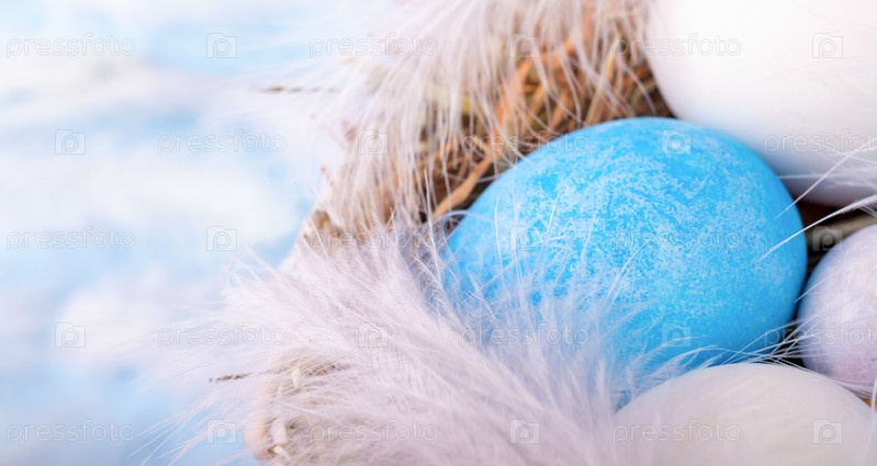 Вид сверху и плоская корзина с сеном, окрашенными в синий и белый цвета яйцами и перьями. Простой и минималистичный пасхальный фон