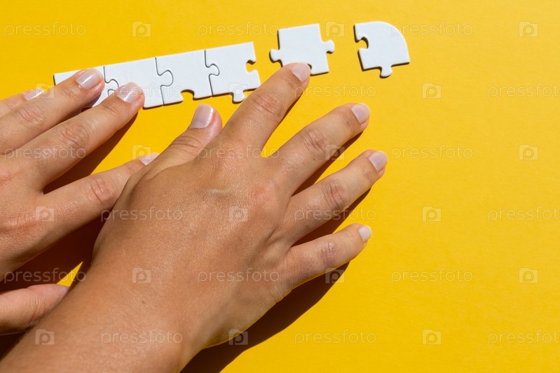 Руки соединяются с кусочком головоломки, чтобы завершить линию на желтом фоне. Концепция успеха