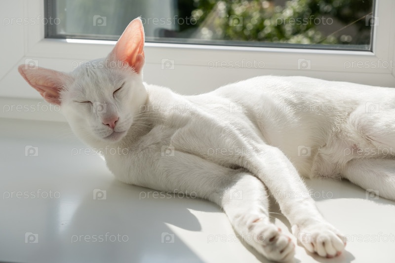 Портрет восточной короткошерстной белой кошки, спящей у окна