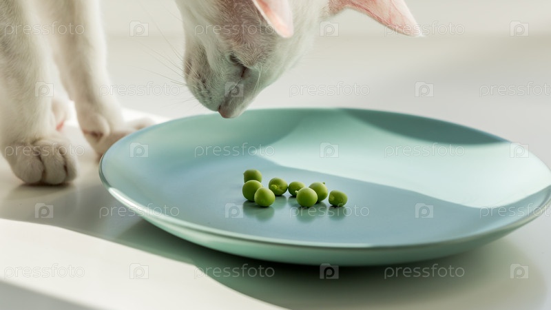 Белый кот ест зеленый душистый горошек. Здоровая веганская еда