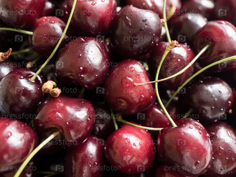 Свежие сочные органические вишни с каплями воды. Еда ягодный фон спелой вишни
