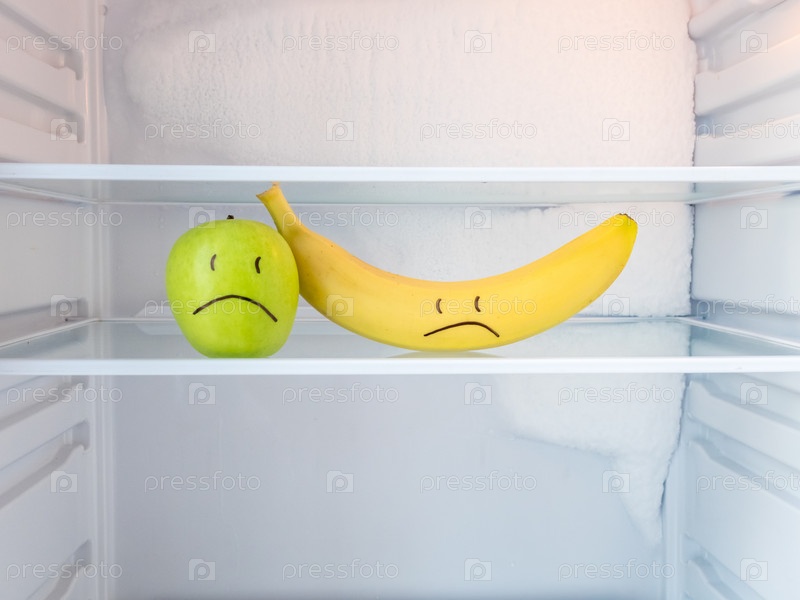 Зеленое грустное яблоко и желтый грустный банан в открытом пустом холодильнике с замороженным льдом на стене. Диета для похудения и концепция голода