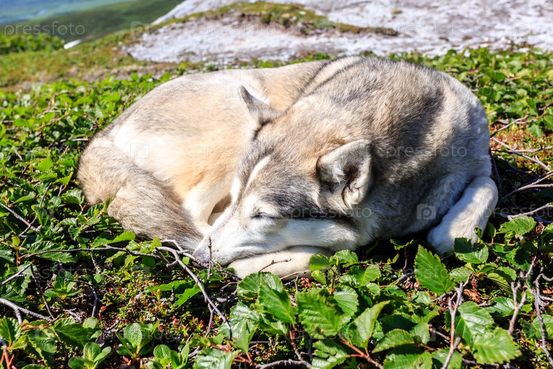 Собака породы Хаски отдыхает на траве в жаркий летний день