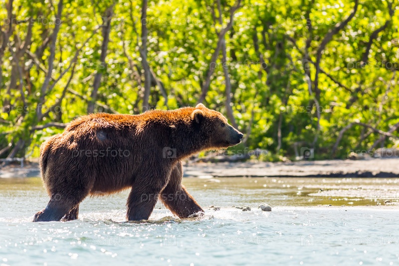 Бурый медведь или Ursus arctos beringianus ловит рыбу в Курильском озере. полуостров Камчатка, Россия