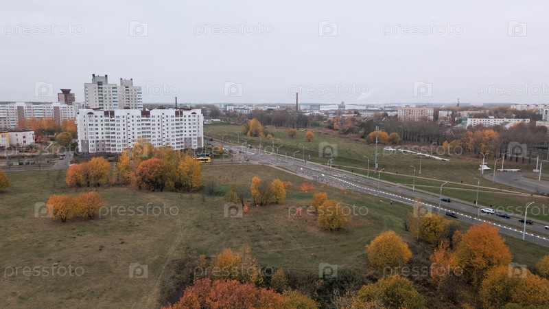 Многоэтажные дома с инфраструктурой. Густонаселенная городская территория. Пасмурная погода. Осенний пейзаж. Аэрофотосъемка