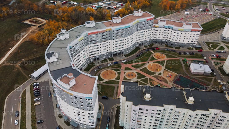 Многоэтажные дома с инфраструктурой. Густонаселенная городская территория. Пасмурная погода. Осенний пейзаж. Аэрофотосъемка