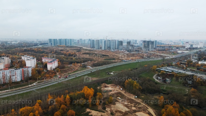 Современная городская архитектура. Строительная площадка нового городского квартала. Строительство многоэтажных домов. Густонаселенная городская территория. Пасмурная погода. Осенний пейзаж. Аэрофотосъемка