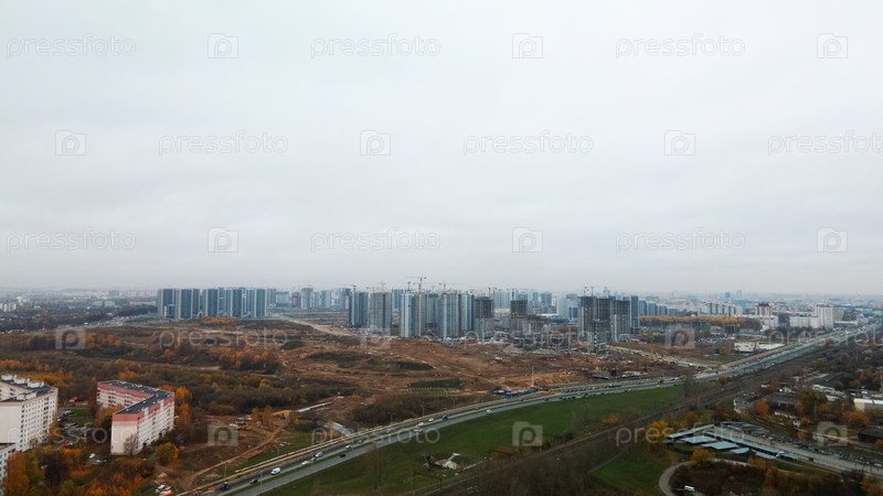 Современная городская архитектура. Строительная площадка нового городского квартала. Строительство многоэтажных домов. Густонаселенная городская территория. Пасмурная погода. Осенний пейзаж. Аэрофотосъемка