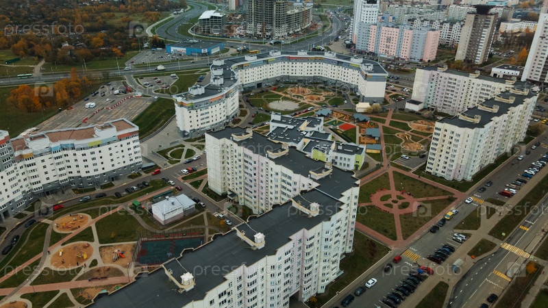Многоэтажные дома с инфраструктурой. Густонаселенная городская территория. Пасмурная погода. Осенний пейзаж. Аэрофотосъемка