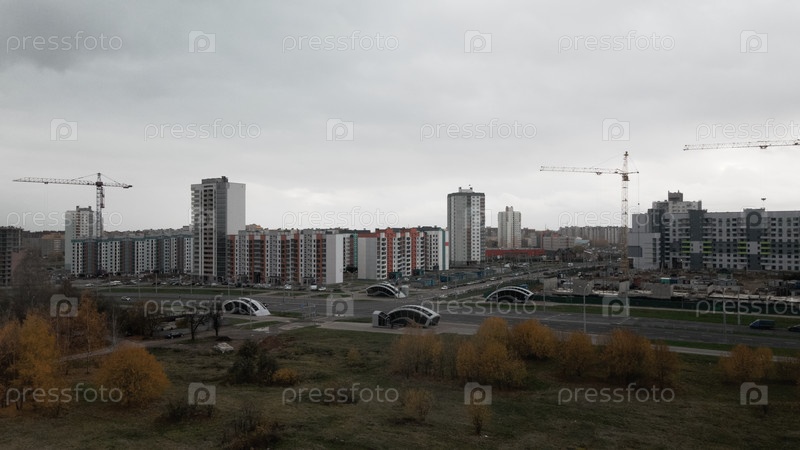 Современная городская архитектура. Строительная площадка нового городского квартала. Строительство многоэтажных домов. Густонаселенная городская территория. Пасмурная погода. Осенний пейзаж. Аэрофотосъемка