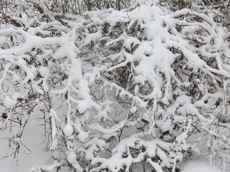 Красивый заснеженный куст с корявыми фактурными ветками