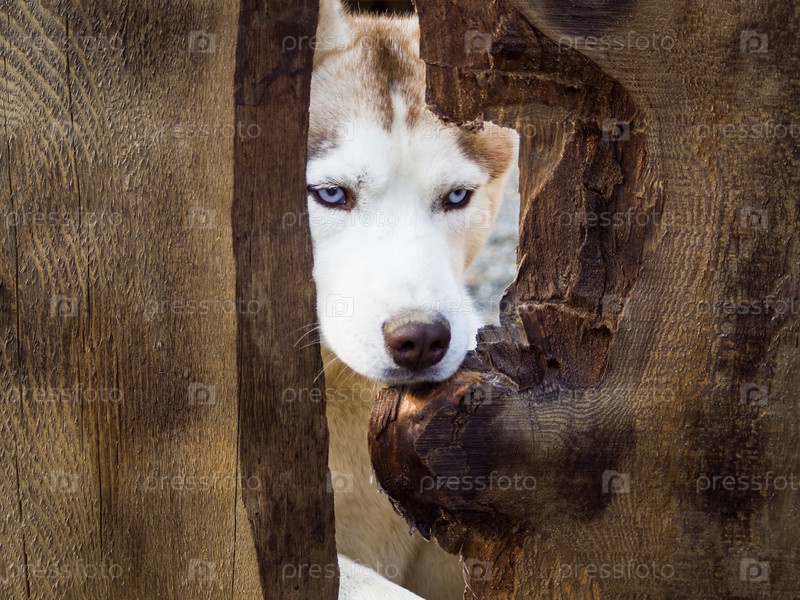 Хаски-собака с голубыми глазами выглядывает из дыры в деревянном заборе