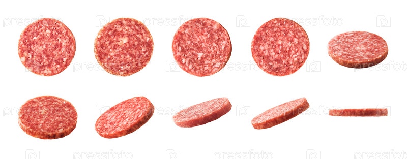 Вид сверху и сбоку на ломтики копченой колбасы салями