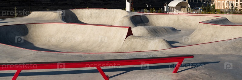 Скейт-парк с бетонной чашей, рельсами и насосной дорожкой