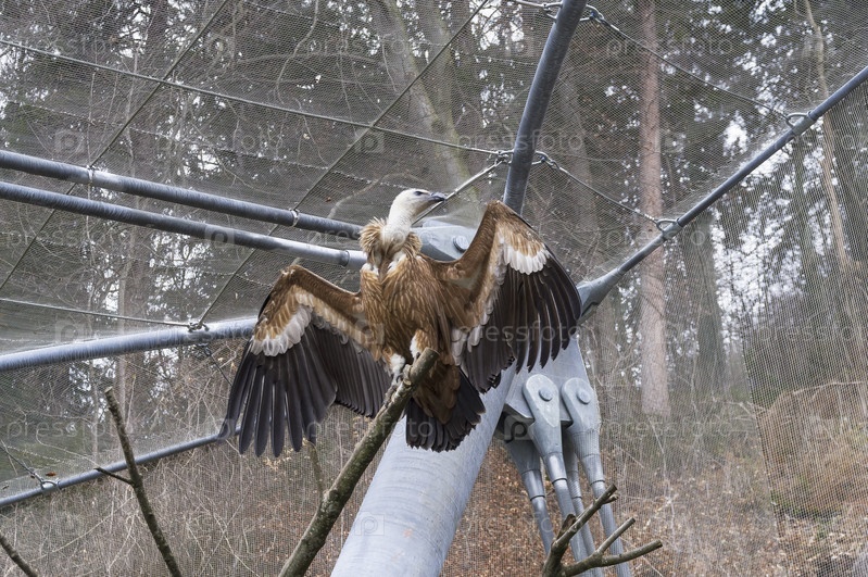 Белый сип (лат. Gyps fulvus) раздвинул крылья, сидя на ветке дерева Alpenzoo (Альпийский зоопарк)