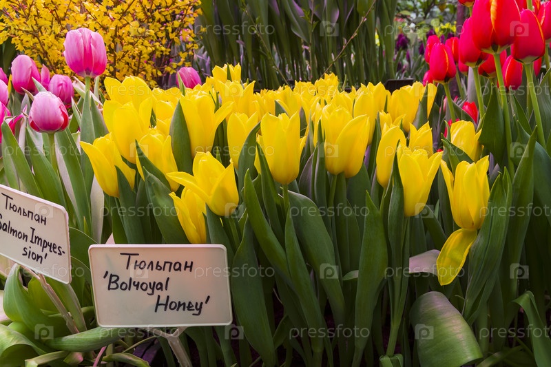 Тюльпаны сорта Bolroyal Honey в оранжерее Аптекарского сада (филиал ботанического сада МГУ, Москва) Выставка 'Весенняя репетиция', 2019 год