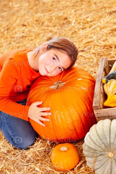 Молодая девушка обнимает большую тыкву на тыквенной грядке