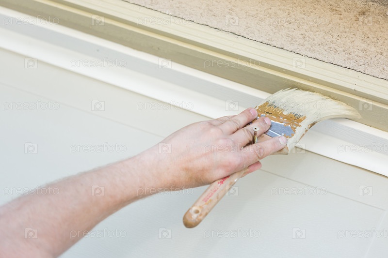 Профессиональный маляр водит кистью, чтобы покрасить дверную раму гаража