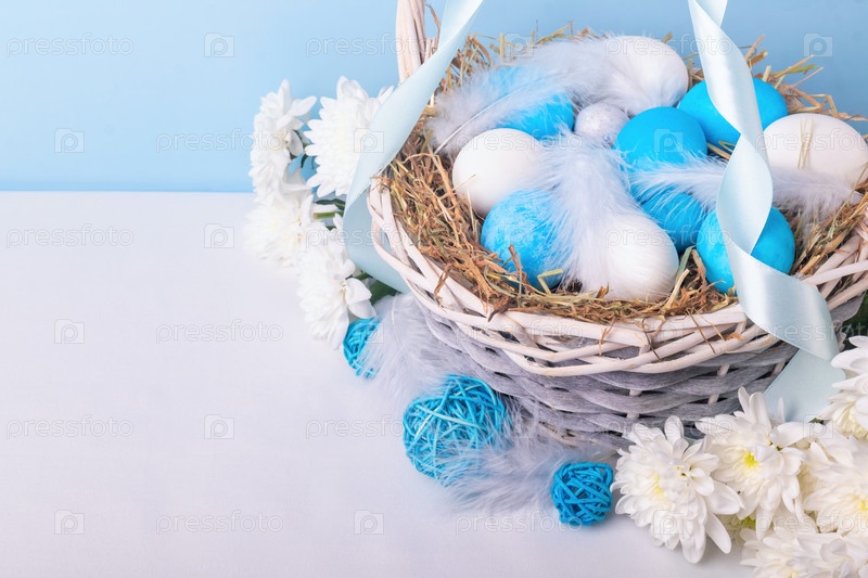 Легкая плетеная корзина, украшенная лентой с сеном, крашеными голубыми и белыми яйцами и перьями. Простой и минималистичный пасхальный фон с цветами и деревенскими праздничными украшениями. Скопируйте пространство