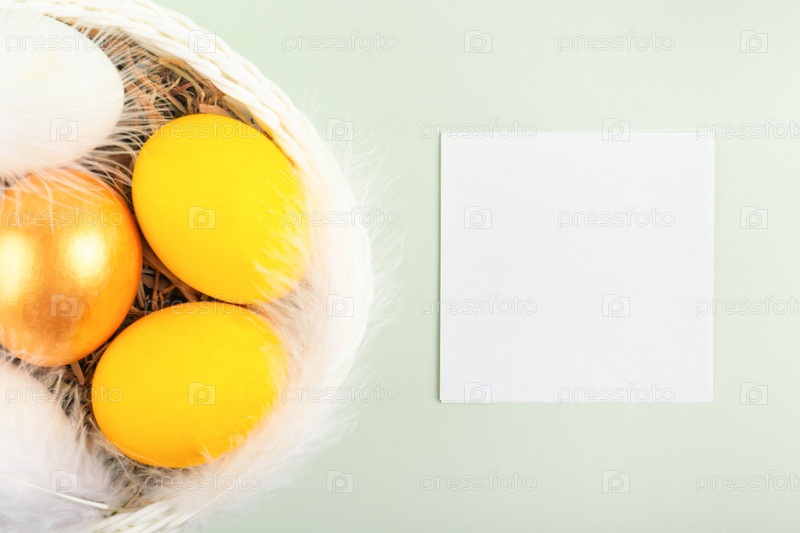 Белый лист бумаги рядом с плетеной корзиной с сеном, раскрашенные золотые, желтые и белые яйца, украшенные перьями. Пасхальный фон