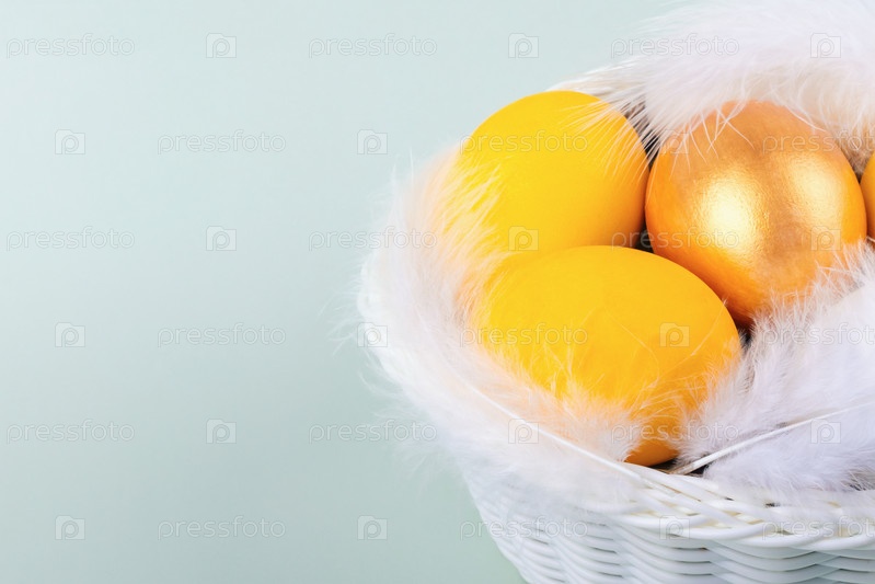 Плетеная белая корзина с сеном, крашеные золотые и желтые яйца, украшенные перьями. Деревенский, минималистичный и простой пасхальный фон
