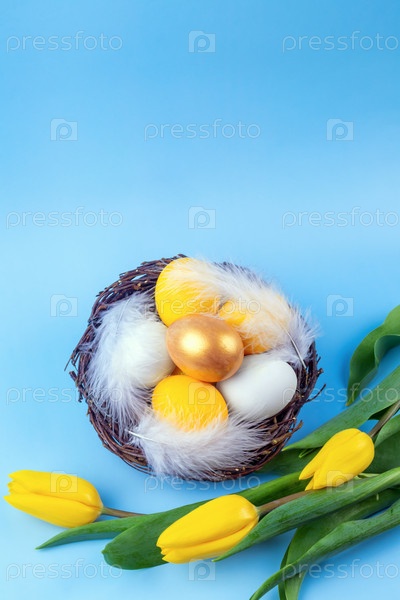 Плетеное гнездо из ветвей деревьев с окрашенными золотыми, желтыми и белыми яйцами, украшенными перьями и цветами тюльпанов на синем фоне. Весенний и праздничный вертикальный фон. Копировать пространство