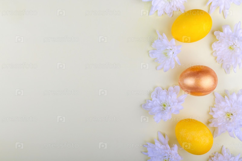 Крупный план золотых и желтых яиц с цветами хризантемы, лежащими в ряд на светло-желтом фоне. Весенний и пасхальный минималистичный фон