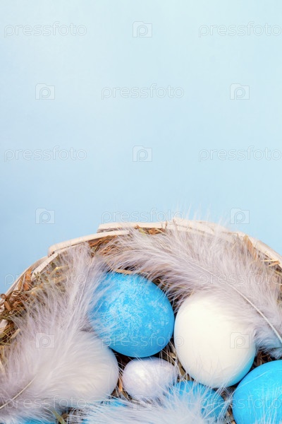 Вид сверху и плоская корзина с сеном, окрашенными в синий и белый цвета яйцами и перьями. Простой и минималистичный пасхальный фон