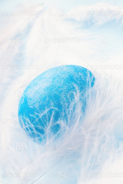 Крупный план окрашенного мраморно-голубого куриного яйца с белыми перьями. Простой и минималистичный пасхальный вертикальный фон