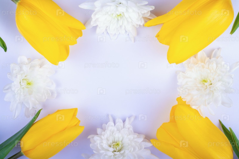Пасхальный и весенний фон с желтыми цветами тюльпанов, белой хризантемой и чистым листом бумаги с копией пространства в центре