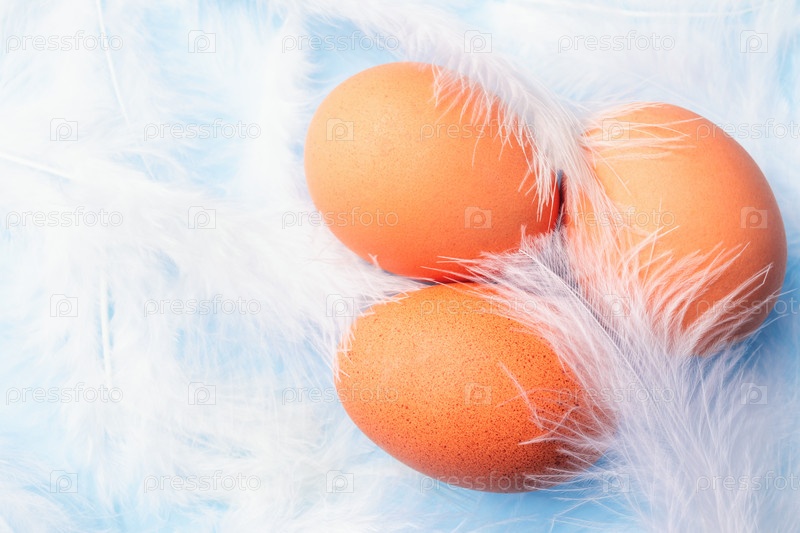 Крупным планом коричневого куриного яйца с белыми перьями. Простой и минималистичный пасхальный фон. Деревенская и сельская праздничная открытка. Концепция органических и экологических продуктов питания